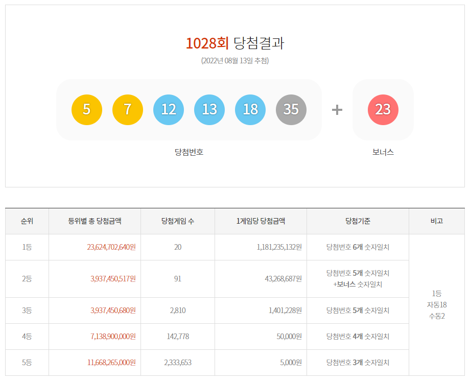 로또 1028회차 당첨 결과