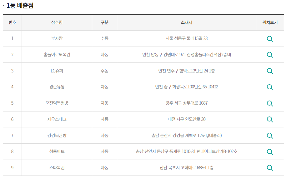 이상 1등과 2등 당첨이 나온 곳들을 한번 봤는데요.