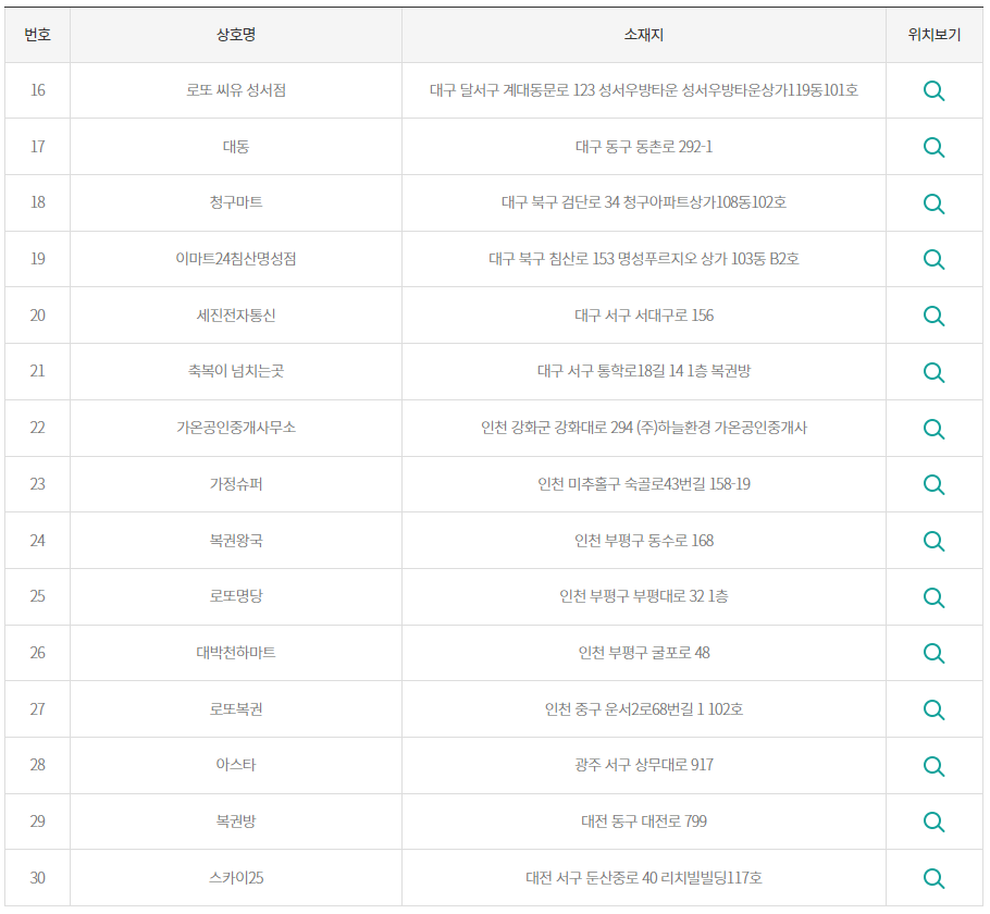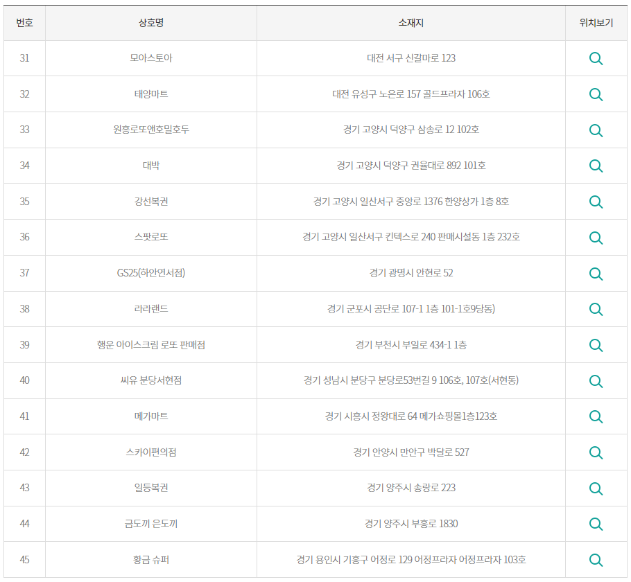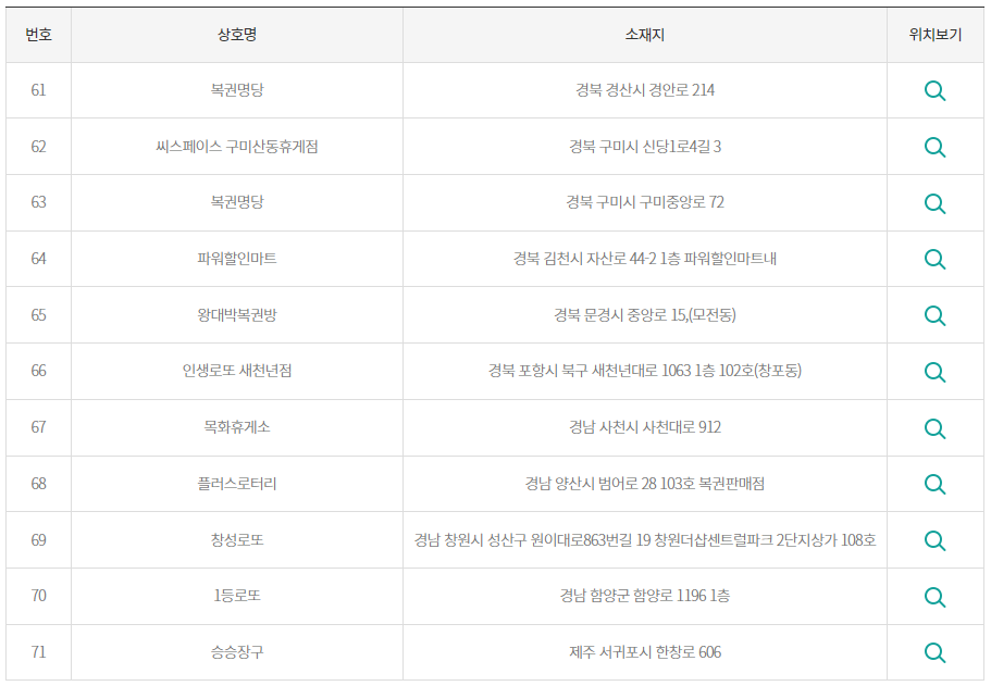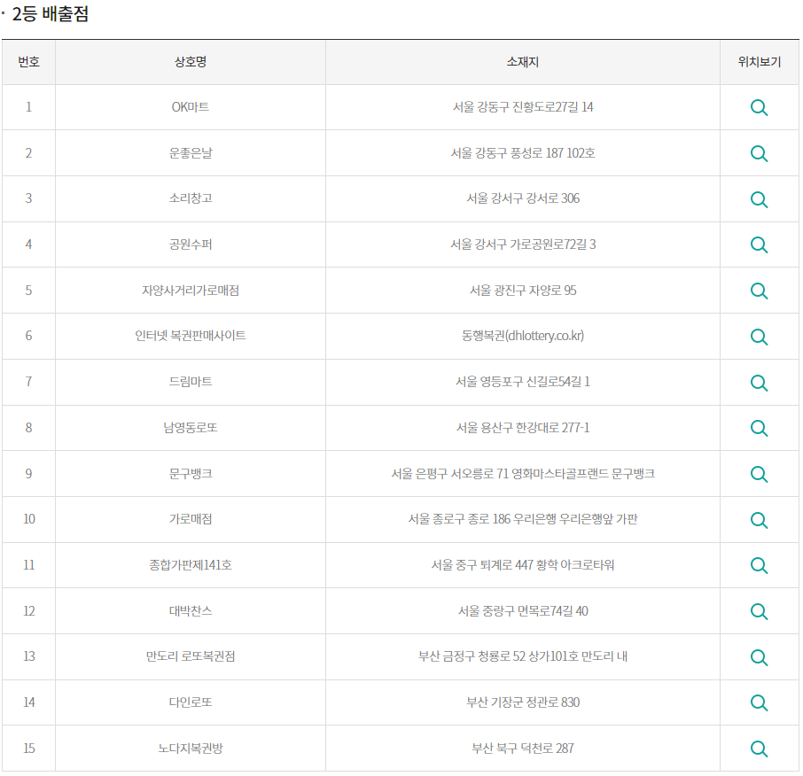 다음으로 1등 과 2등 당첨 판매점은 전국 어느 지역에서 나왔는지 보겠습니다.
