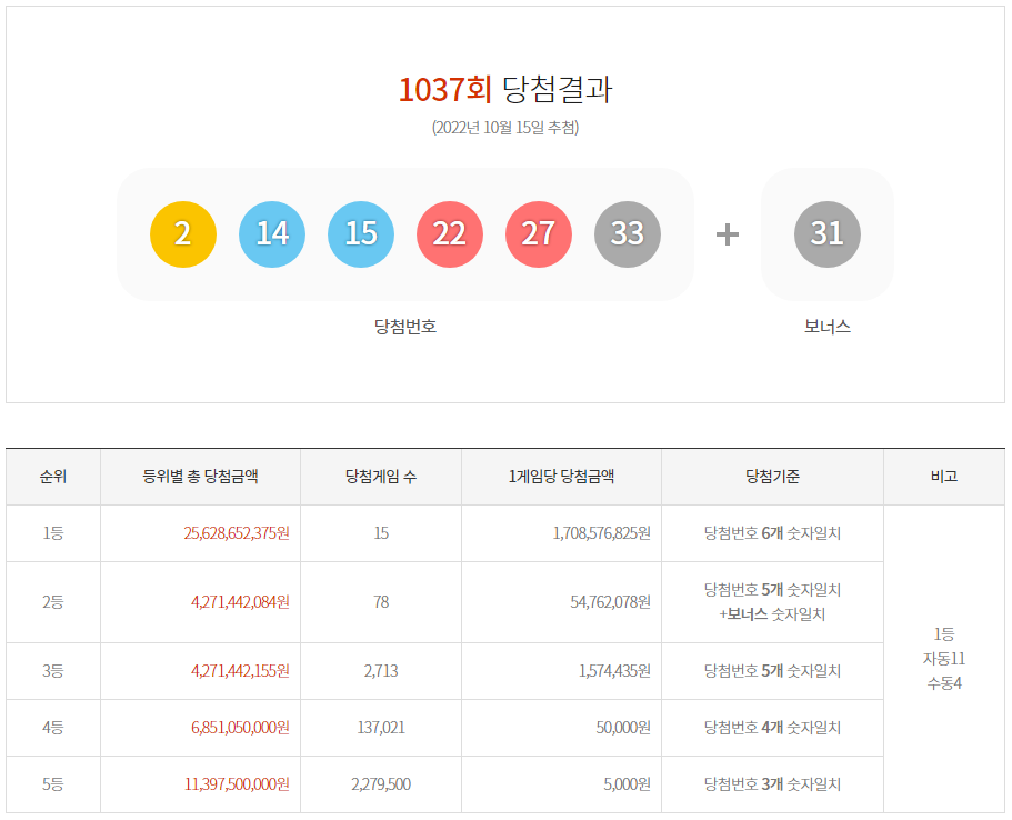 자동 당첨이 11게임, 수동 당첨이 4게임으로 나왔는데