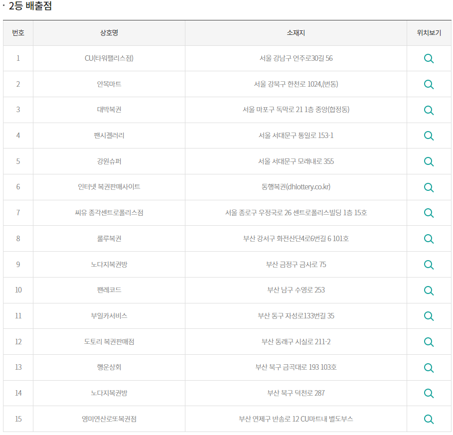 당첨번호와 1등 당첨 판매점 및 2등 당첨 판매점은