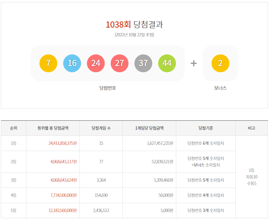 이번 회차 1등 당첨은 자동 당첨이 10게임, 수동 당첨이 5게임으로