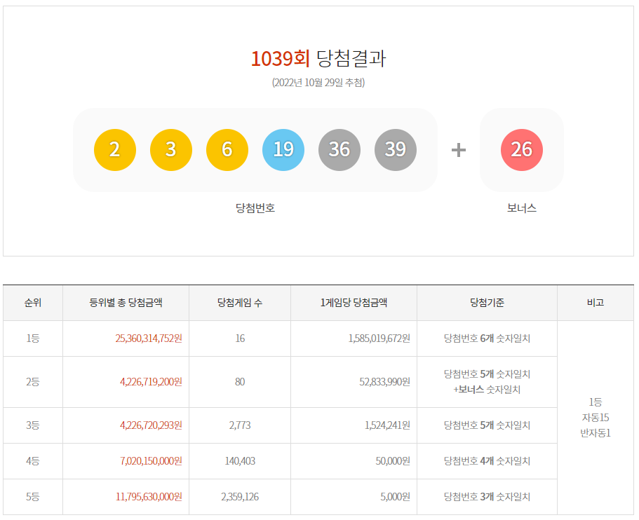 그전에 1039회 차 1등 당첨 번호부터 본 후 맨 마지막에는 1040회 예상 제외수도 같이 공개하겠습니다.