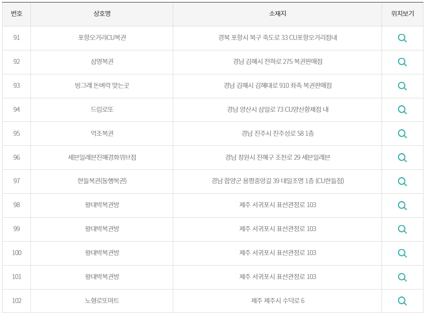 이번 회차 2등 당첨은 무려 102게임이나 나왔는데 오랜만에 중복 당첨이 많이 나와서 그런 것 같습니다. 동행복권 온라인 사이트를 비롯하여 2게임 씩 중복 당첨이 나온 곳이 몇 군데가 있고 제주에 위치한 왕대박 복권방에서는 4게임이나 중복으로 당첨이 나온 것을 볼 수가 있습니다.