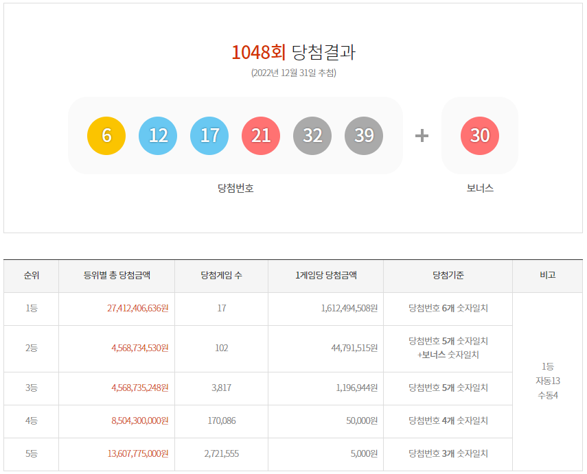 1048회 당첨 번호는 위와 같이 나왔습니다. 6번, 12번, 17번, 21번, 32번, 39번이고 보너스 번호로는 30번이 나왔습니다. 1등 당첨의 수는 총 17게임이 나왔으며 각 당첨금으로는 16억 1천 만원씩 수령하실 수 있겠습니다. 세금을 제외하면 11억 1천3백여만 원을 가져가실 수가 있을 것 같습니다.