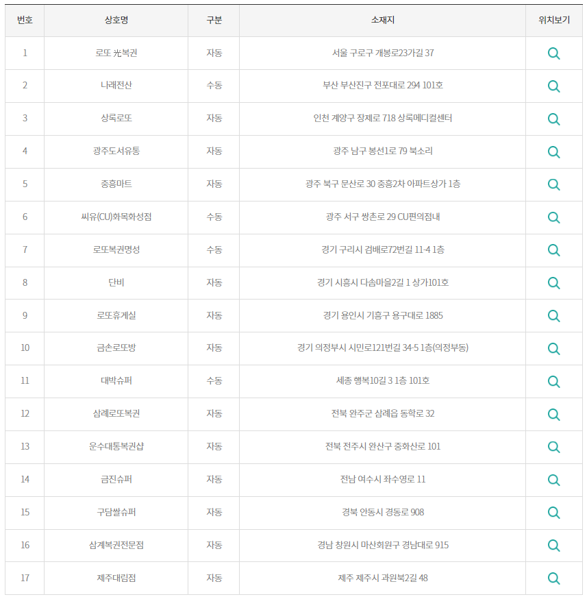 1등 당첨의 유형으로는 자동이 13게임, 수동이 4게임으로 자동 당첨이 역시나 강세로 나타난 것을 볼 수 있겠습니다.