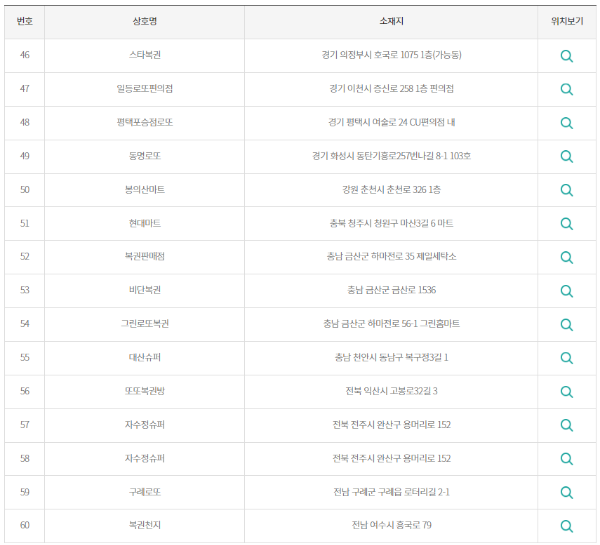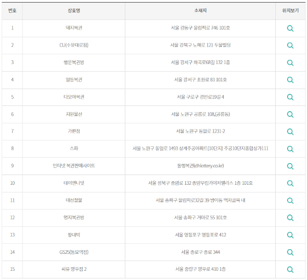 2등 당첨에는 가장 유명한 서울 노원구에 위치한 스파에서 1게임, 인터넷 동행복권 온라인 홈페이지에서 1게임씩 각각 나오게 되었습니다. 그 외 경기 시흥 및 전북 전주에서 2등 당첨이 중복으로 나온 것 빼고는 골고루 당첨이 나온 것을 볼 수가 있겠습니다.