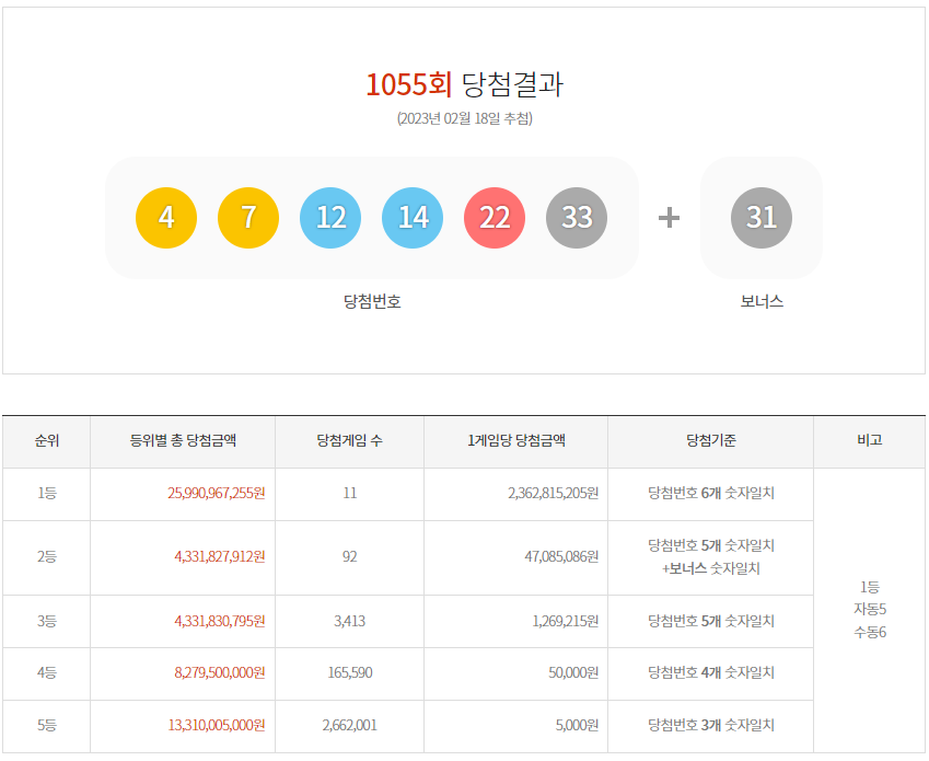 1055회 차의 1등 번호로 4,7,12,14,22,33 번호가 나왔습니다. 2등 당첨 번호인 보너스 번호로는 31번이 나왔고 40번대가 전멸한 오랜만에 평범한 번호들로 당첨 번호들이 나온 것을 볼 수 있겠습니다.