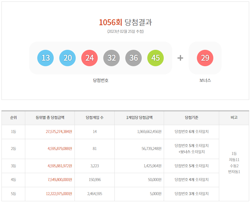 1056회 1등 번호로는 13, 20, 24, 32, 36, 45 번호가 나오게 되었습니다. 2등 번호인 보너스 번호는 29번이 나왔고요. 단번대가 한 수도 나오지 않은 회차였습니다.