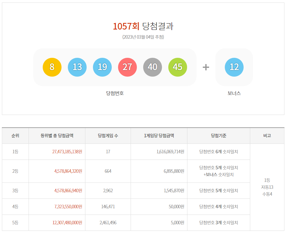 1057회 1등 번호는 8, 13, 19, 27, 40, 45 번호가 나왔으며 2등 보너스 번호로는 12번이 나왔습니다. 30번대를 제외 하고는 모든 번호대가 고르게 나온 회차 였습니다.