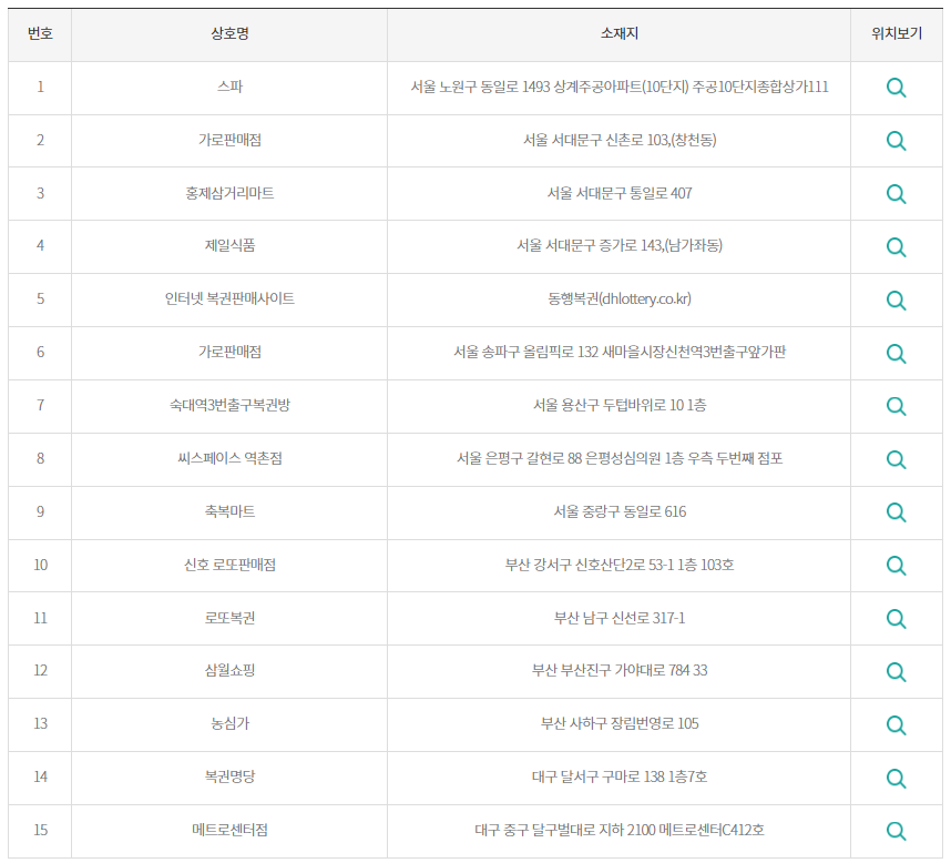로또 명당인 서울 노원구의 스파에서도 2등 당첨이 나왔습니다. 그리고 동행복권 온라인 홈페이지에서도 2등 당첨이 나왔고 그외 전국 판매점에서 골고루 당첨이 나온 것을 볼 수 있겠습니다. 3게임 이상 중복으로 당첨 나온 곳은 없는 거 같고 2게임 이상 당첨이 나온 판매점은 1곳정도밖에 안 나온 것으로 보입니다.