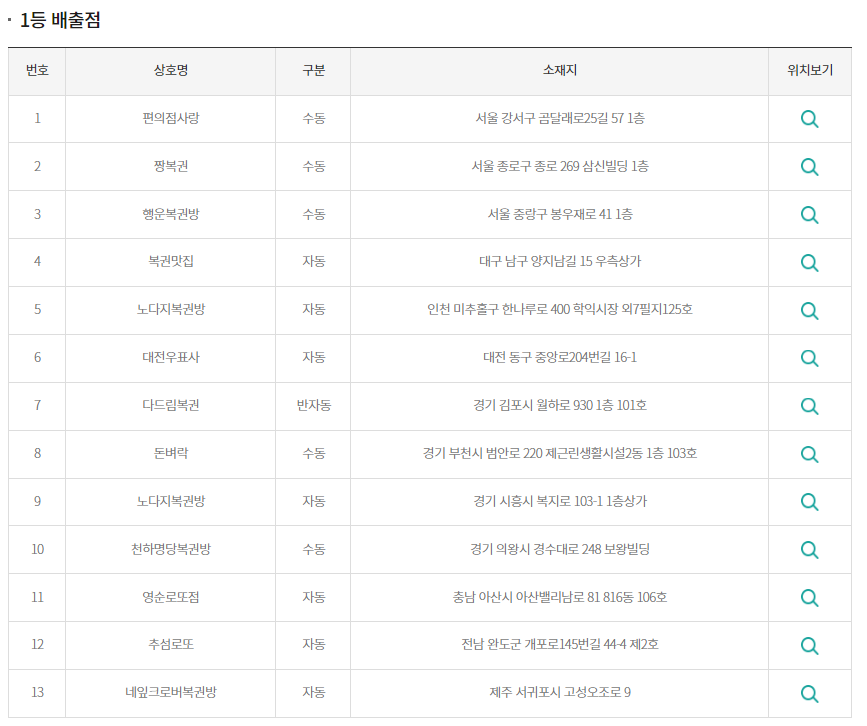1등 당첨 총 13게임중 당첨 유형으로는 자동으로 7게임 당첨, 수동으로 5게임 당첨, 반자동으로 1게임이 각각 당첨으로 나오게 되었고 자동 당첨이 조금 더 많이 나온 회차로 기록되겠습니다. 1등 당첨이 나온 판매점을 밑의 그림참고 하시면 되겠습니다.