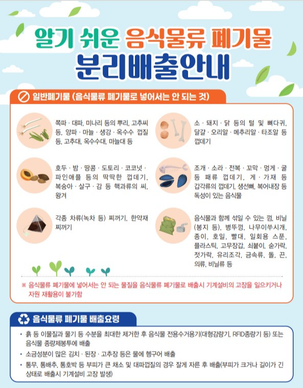 - 음식물 쓰레기로 버리면 안 되는 것: 계란껍데기, 조개껍데기, 커피 찌꺼기 등