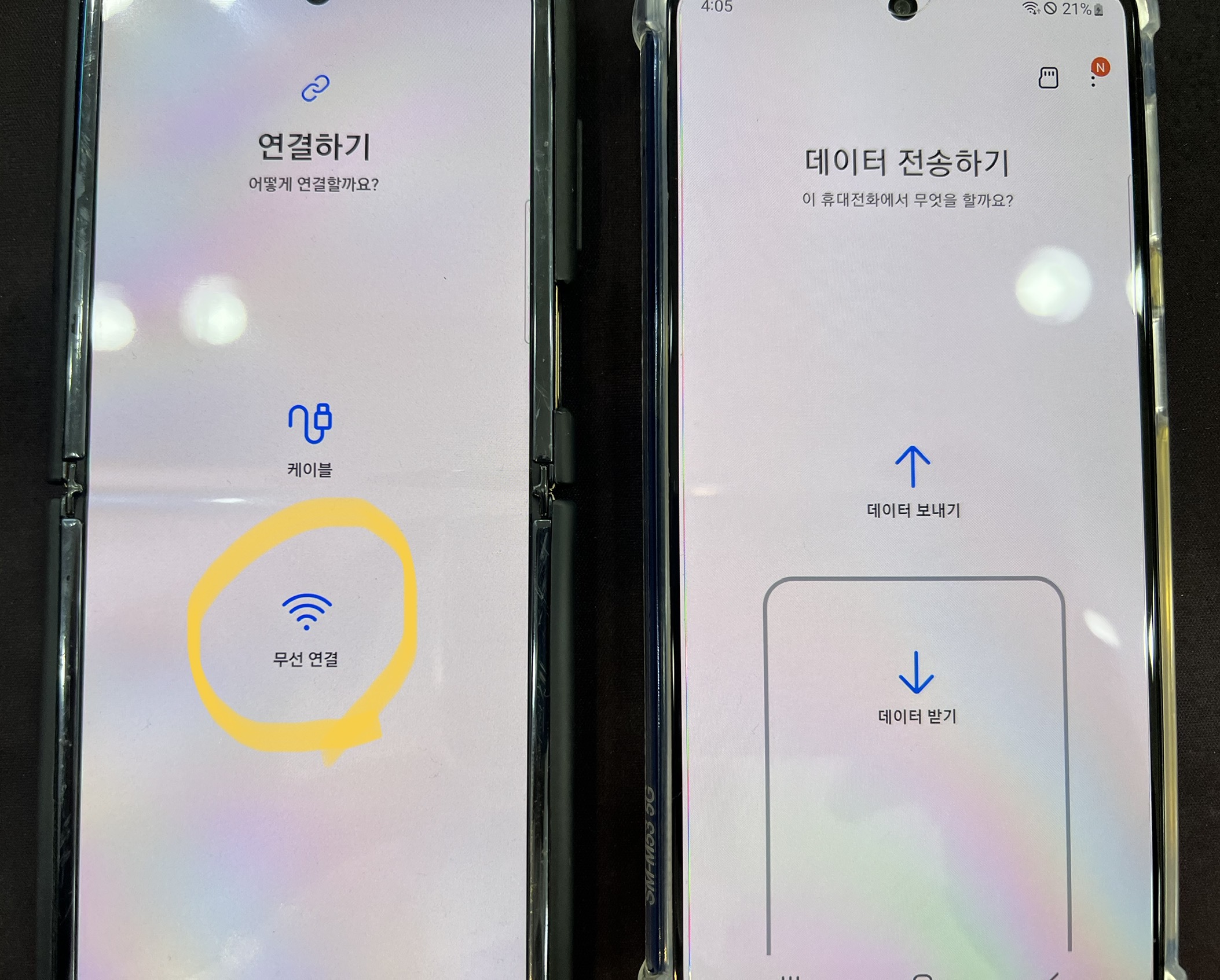 무선 연결 버튼을 눌렀으면 기존 휴대폰에서는 데이터를 보내기 위한 준비가 끝났음을 나타냅니다.