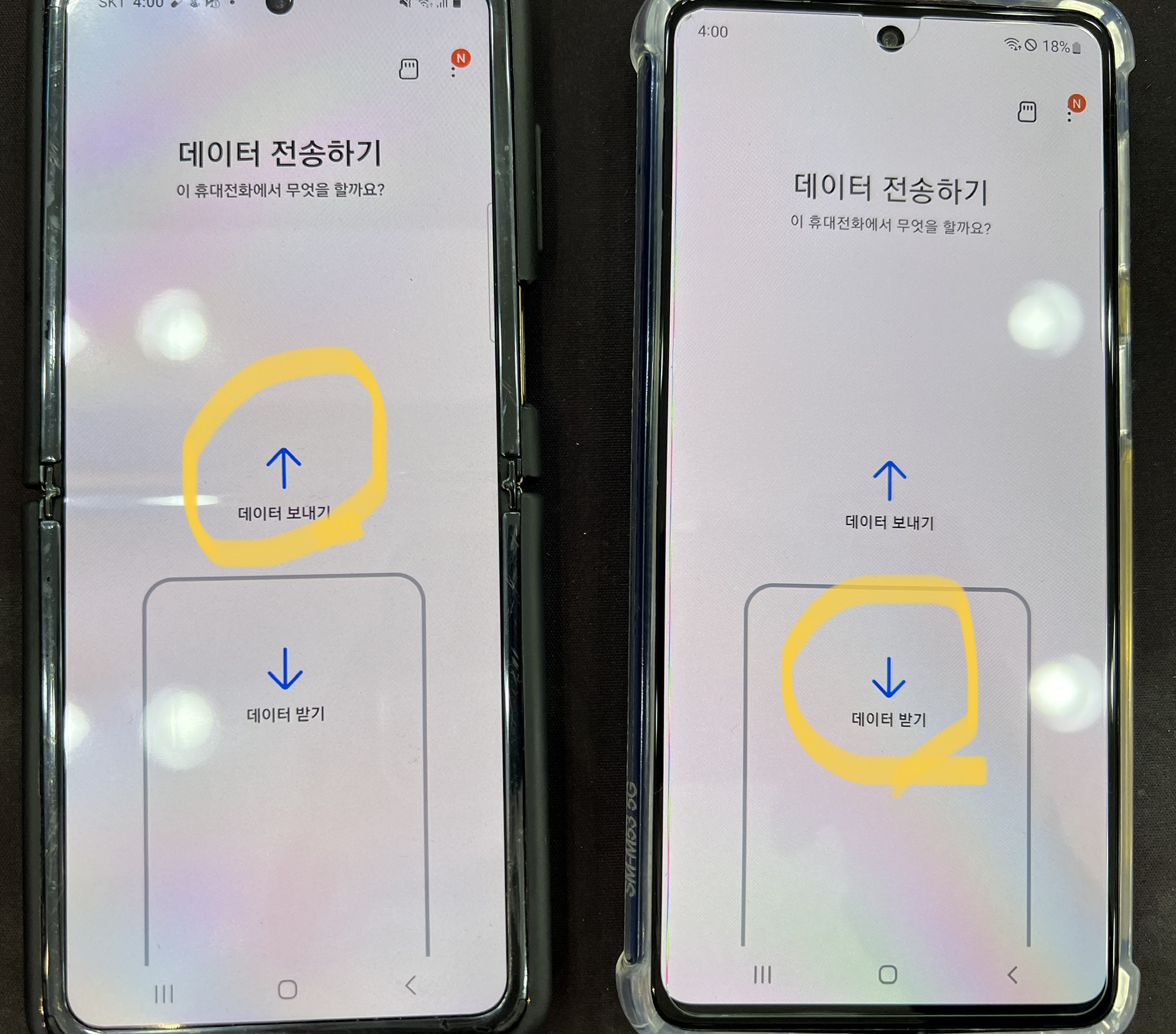 기존 휴대폰에서는 데이터 보내기를 누르고 새 휴대폰에서는 데이터 받기를 누릅니다.