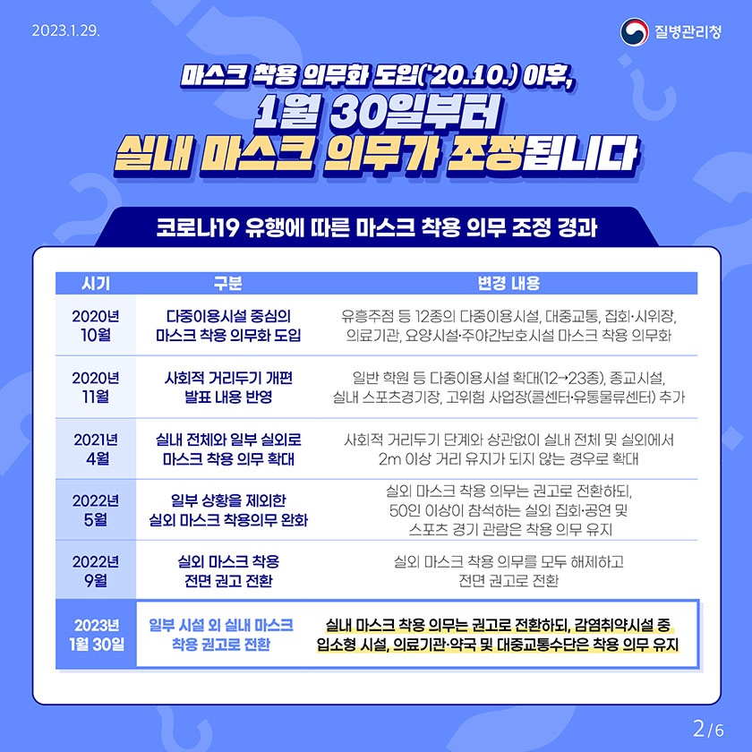 1월 30일부터 실내마스크 의무가 전면 해제 됩니다. 완전 해제는 아직 아니고 일부는 의무, 일부는 권고 사항으로 변경이 되었는데 복잡하지만 어디서는 권고이고 어디서는 의무 착용인지 한번 살펴보도록 하겠습니다.
