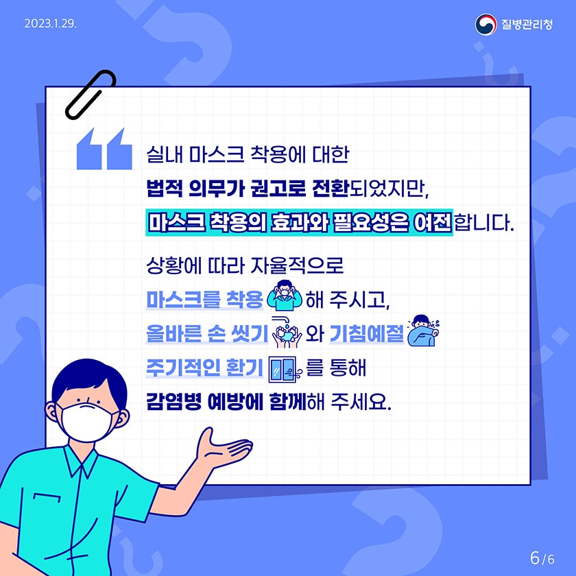 방역 당국은 "실내 마스트 착용 의무가 조정되더라도 마스크 보호 효과 및 착용 필요성이 사라지는 것은 아니며, 법적 의무에서 착용 권고로 전환되는 것"이라면서 상황에 따른 개인의 자율적 착용 실천이 중요함을 강조했습니다.