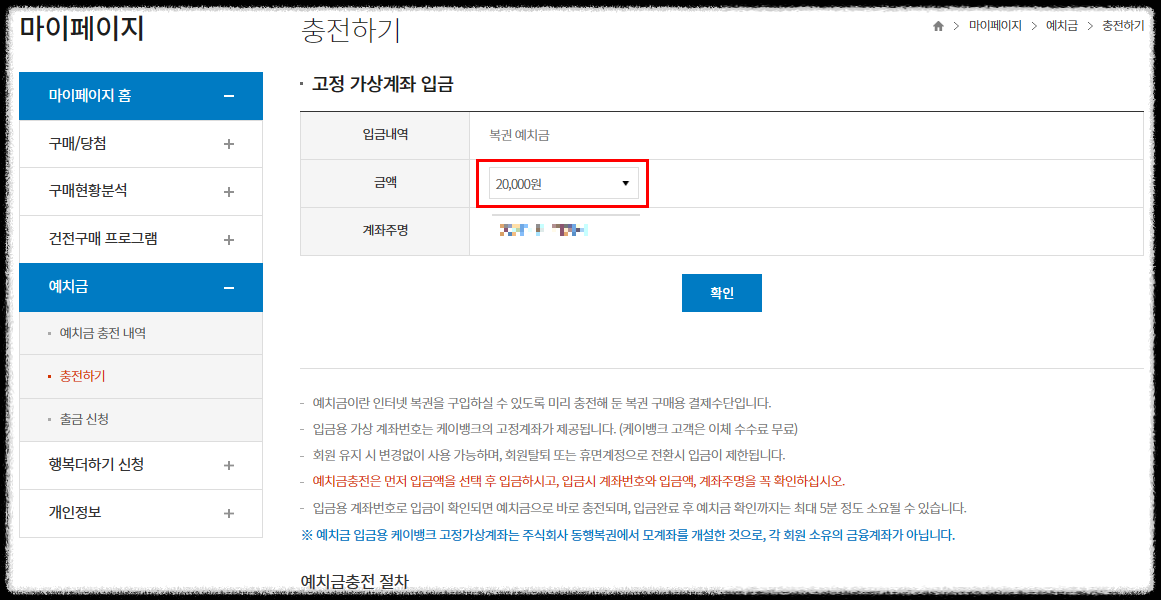 계좌 개설이 끝나면 나만의 케이뱅크 동행복권 전용 입금계좌가 고정으로 입력이 됩니다. 매주 로또 구매를 할 때 그 계좌로 입금을 하면 되는데 최소 5천 원부터 최대 100만 원까지 선택이 가능합니다. 물론 로또 구매할 수 있는 금액은 일주일에 5천 원어치로 한도가 있지만 예치금 충전은 100만 원까지 한 번에 선택이 가능합니다.