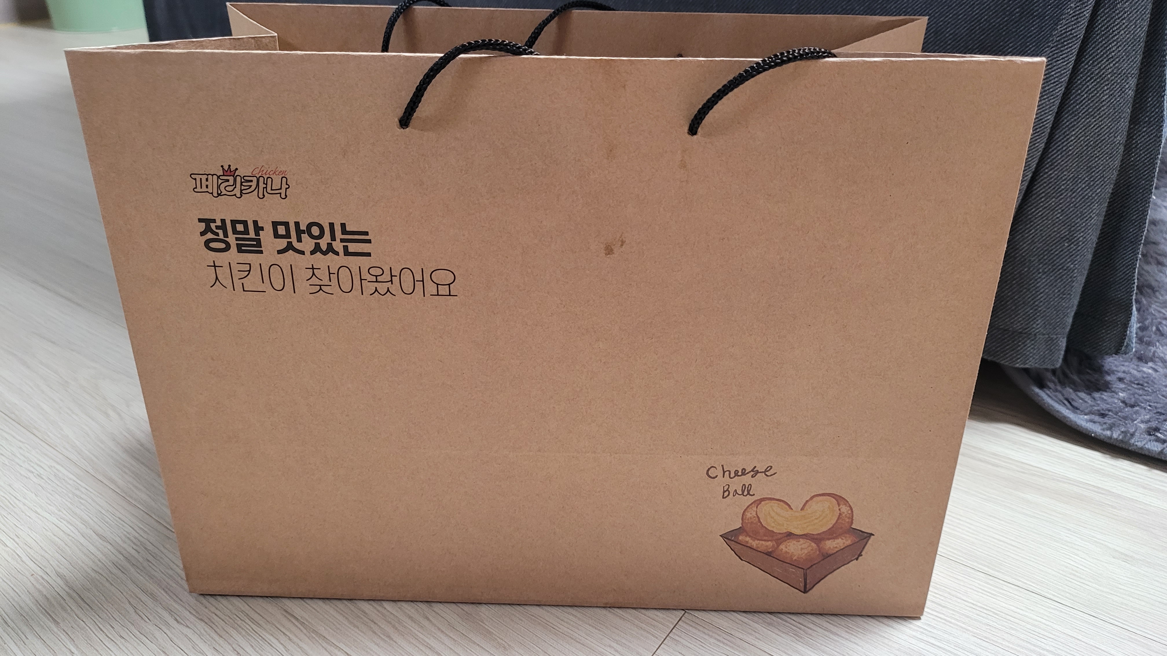 종이백 겉면에 쓰여있는 "정말 맛있는 치킨이 찾아왔어요"라는 문구는