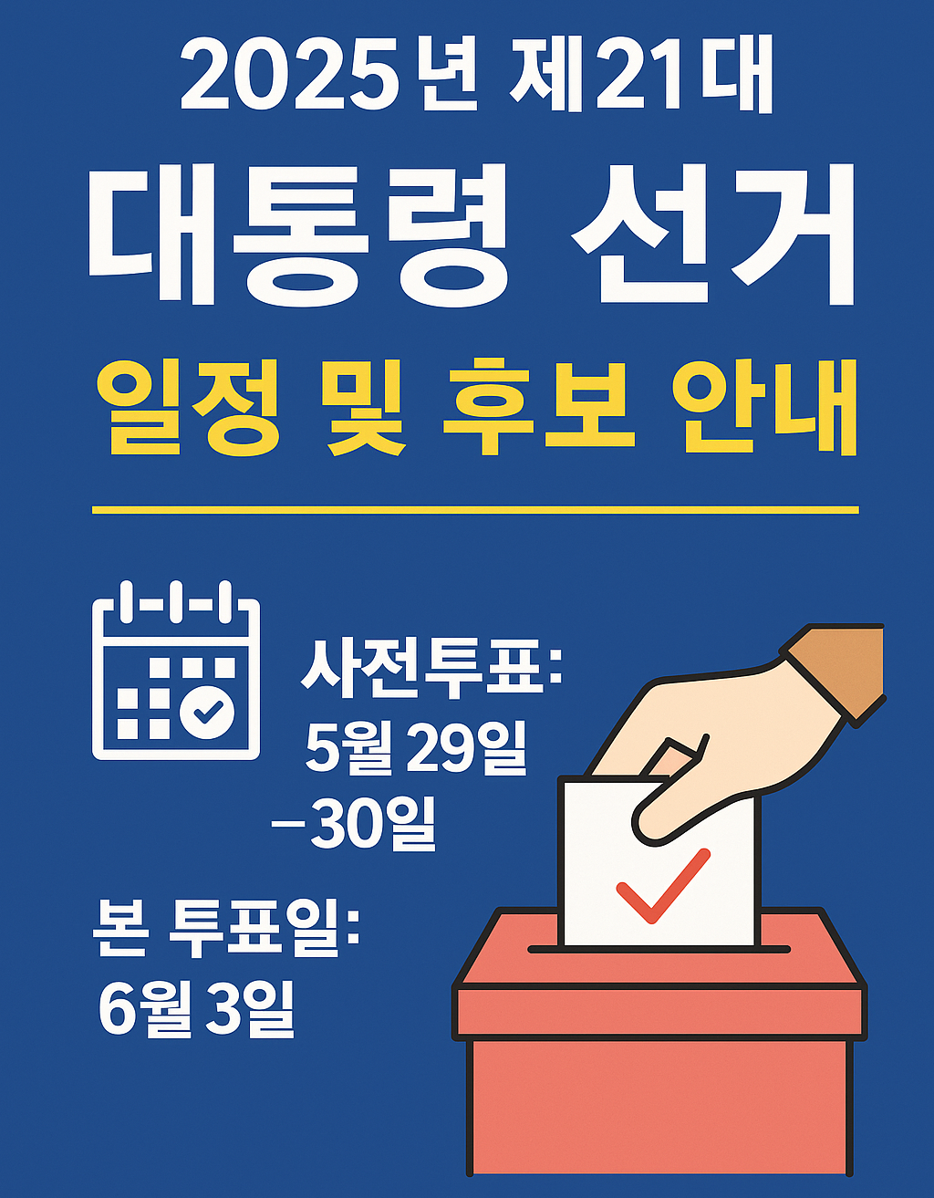 2025년 6월 3일, 약 20여 일 후면 대한민국은 새로운 대통령을 선출합니다. 전 대통령의 탄핵으로 인해 조기에 치러지는 이번 선거는 정치적 전환점이 될 중대한 시점입니다. 이번에는 21대 대통령 선거 일정 및 주요 후보별 공약에 대해 한번 알아보도록 하겠습니다.